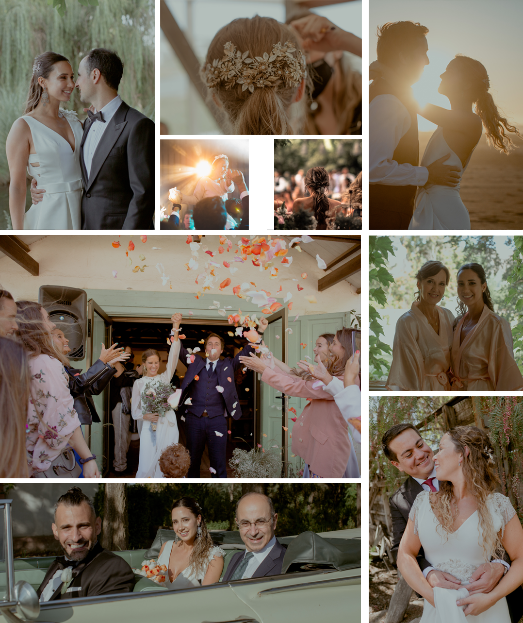 Cobertura maquillaje, ceremonia, momentos de la sesión, recepción y fiesta. Post producción con selección de los mejores momentos y música elegida por los novios.